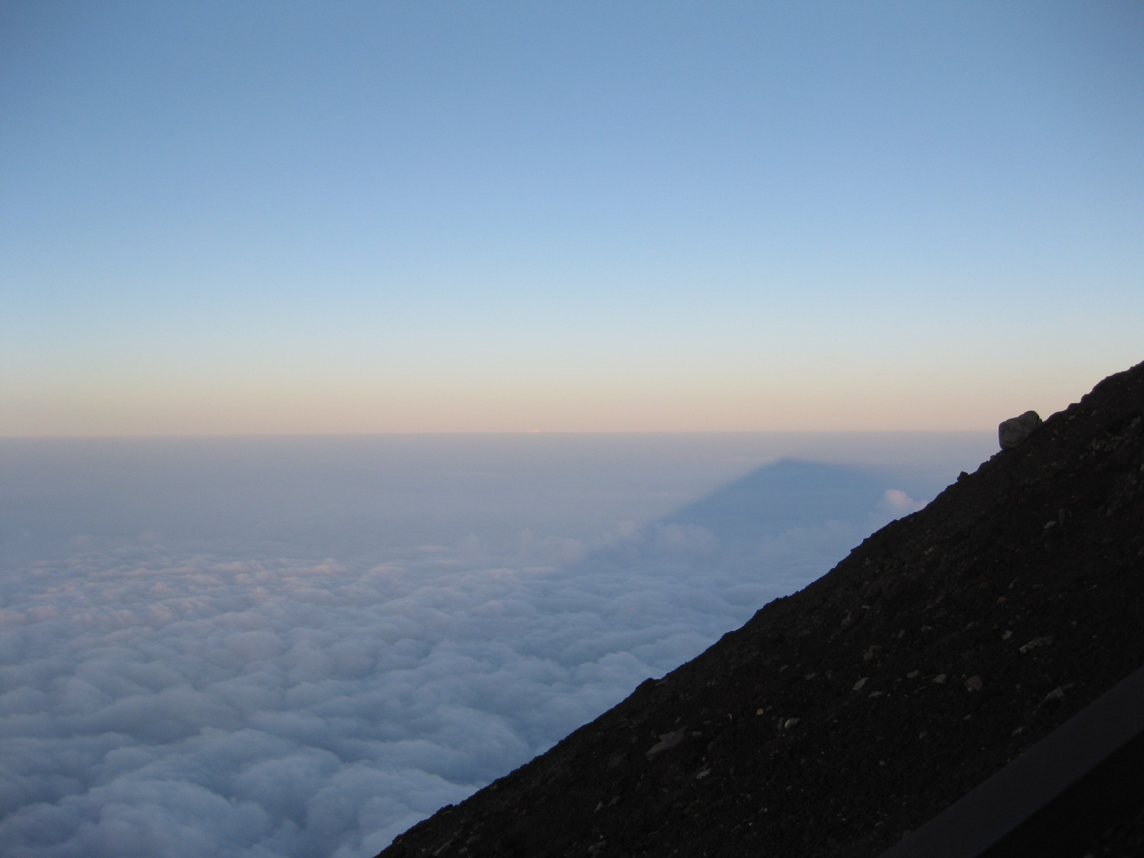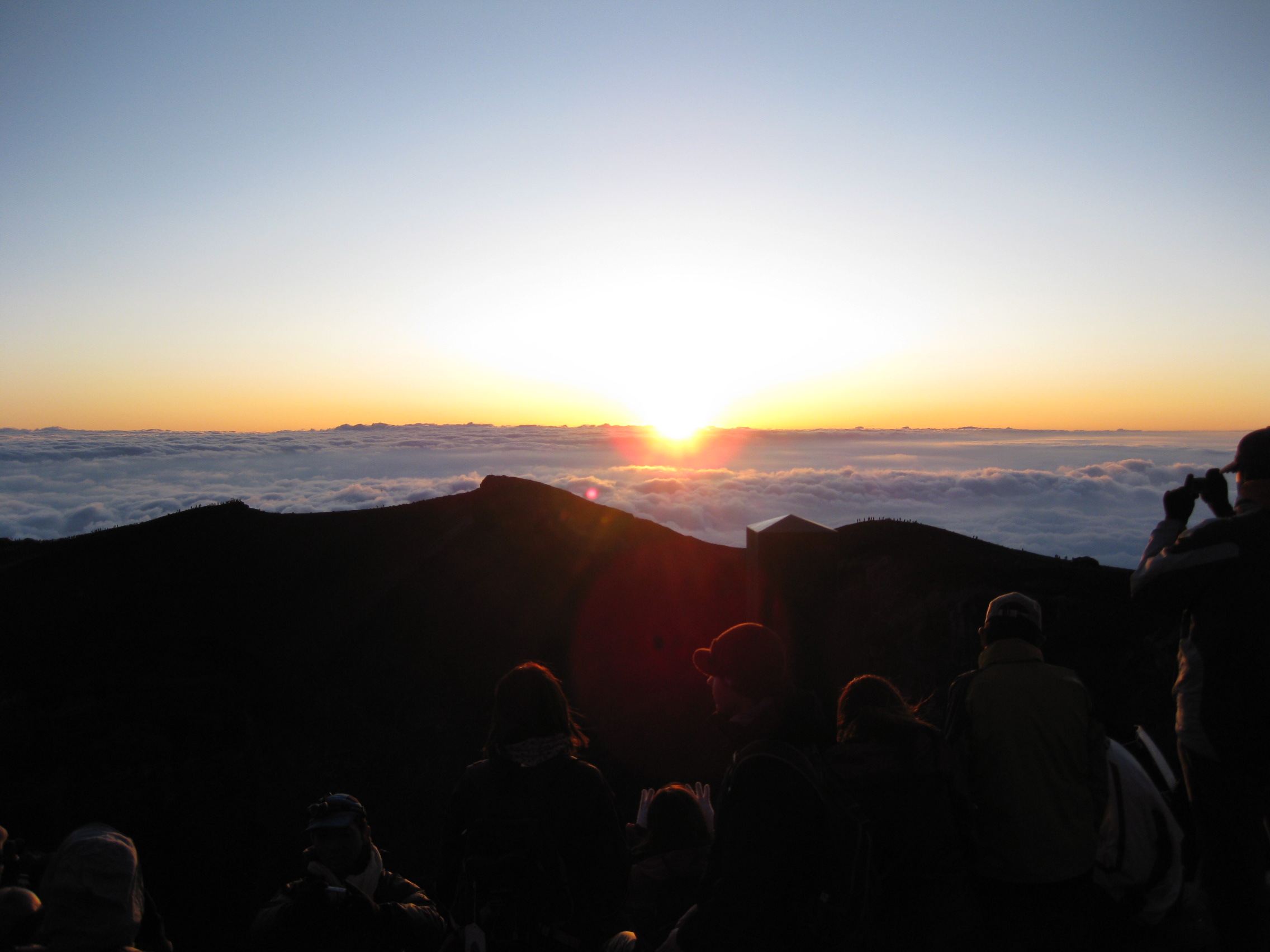 その日、富士山頂の剣が峰(3776m地点)に日の出を見に集まった人々は、それでも100名近くはいました。