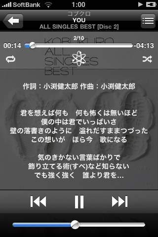ついでに紹介しておくと、iPhoneでは、こんな感じで曲の歌詞を表示することもできます。