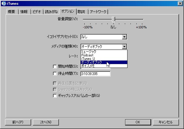iTunesでデータを取り込んだ後、曲のプロパティを開き、オプションタブで「メディアの種類」をオーディオブックにします。