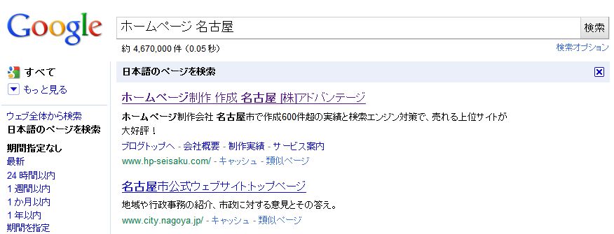 ちなみに、当社サイトは、Googleの「ホームページ 名古屋」検索で、上の画像のように500万件中第1位。
