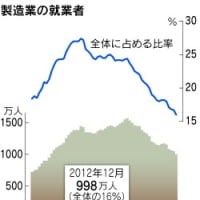 2012年12月の製造業の就業者数が前年同月比35万人減って998万人となり、51年ぶりに1000万人を下回ったそうです。 就業者全体に占める製造業の割合も16%にまで落ち込んだようです。 日本の主産業はとっくに製造業ではなくなっているのですね。 どうしてもいつまでもMade in Japanのイメ>>もっと読む